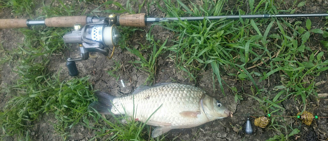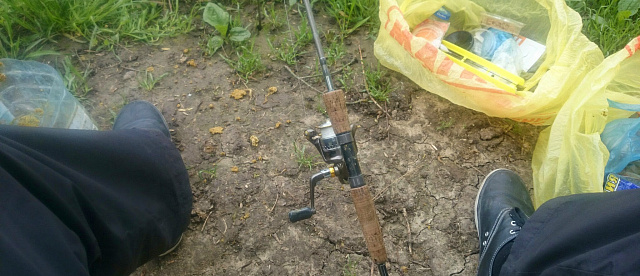 В качестве удилища - спиннинговый Banax Thunder с тестом 3-14, прикормка местная, ростовская "Карась", наживка - остатки опарыша и накопал во дворе червяков. Ловил на оснастку "Убийца карася" - 3 мелких пружины, 3 крючка.
