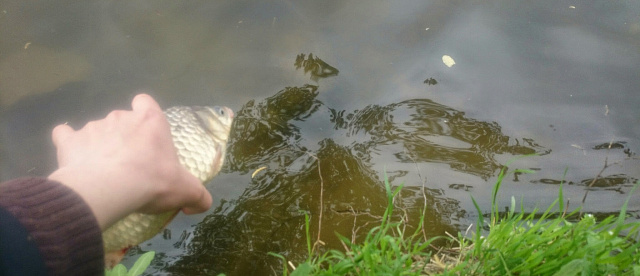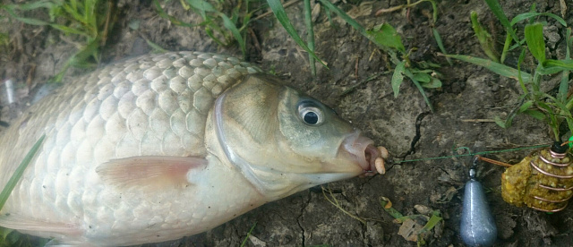 Замесил прикормку, нацепил бутербродом червь+опарыш, забросил на какие-то 15 метров, дальше банаксом не рискнул кидать тяжелую оснастку. На вершинку-колокольчик, все как положено... сижу жду... мощнейшая поклевка, чуть спиннинг не утянуло в озеро... вытягиваю - гибрид грамм на 700. Берег хоть не высокий, но обрывистый полметра, просто так рыбу не возьмешь, а подсака нету. Пока думал как достать - гибрид сошел.