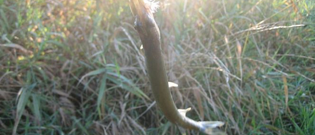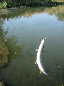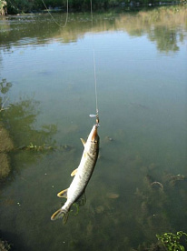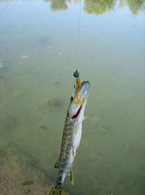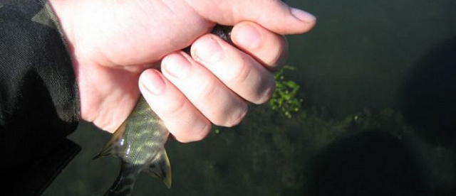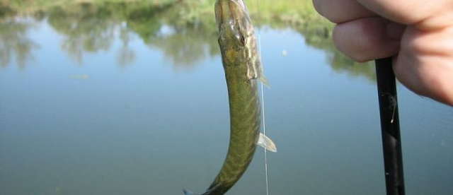 ceed-ом прошлый раз ловили щуров на ольховке. Вода как обычно мутная и грязная, потому начал с маньячек. Было пару невнятных тычков, а затем первая [[щука|щучка]].