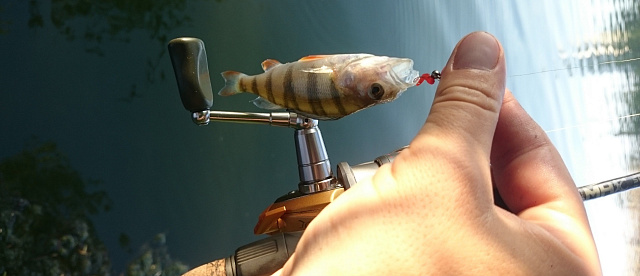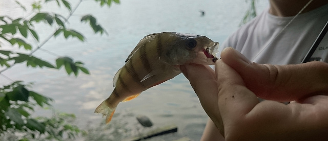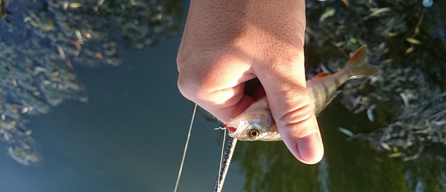Подобрал проводку, с каждой точки ловил минимум 5 окуней, а потом получил бонус в виде полукилограммового карася. Поборолся с ним долго, сил в нем много. Боялся, что заведет в корягу, или что шнура 0,06 не хватит, всетаки за 3 года его сильно поубавилось, но все же вытащил.
