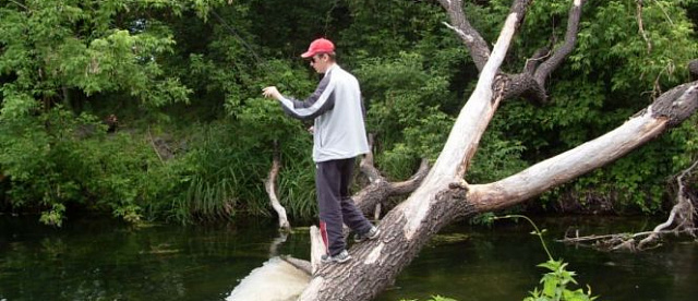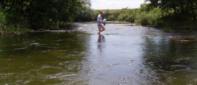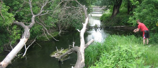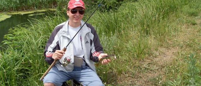 У нас же голавль на перекате не хотел брать искусстевенные приманки, потому пошли вниз по течению в ранее неизведанные места. Там Айдар очень мелкий, но широкий. Часто заходили на середину реки, где глубина по колено. В новых местах наконецто я обрыбился. Взял на вертуху 2-Меппс хорошего, но еще не зачетного голавля, чуть крупнее ладохи. Ударил сильно, и боролся тоже серьезно, я уже думал там кило не меньше... Дальше на винницкий головастик попался мне [[окунь]], тоже больше ладони. А отец взял голавлика, тоже не крупного на салмо хорнет.
