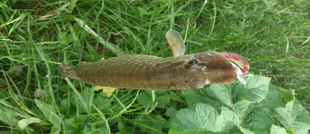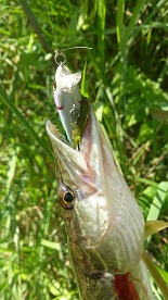 Он проявил себя неплохо (а может щука там голодная) на него сразу начались атаки, но почему-то рыба не засекалась. Интересно что все атаки были на струе, на перекате, там мелко, и рыбу я видел. Думал голавли бьют, но в итоге засек щучку.