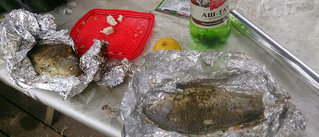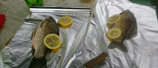 Пока ждали карпа, не забыли и про спиннинг, на микруху ловились щучки и костыли. В обед решил сделать наше фирменное походное блюдо из рыбы в фольге и с лимоном, получилось очень вкусно.