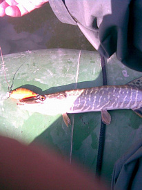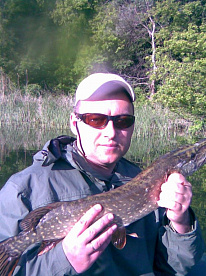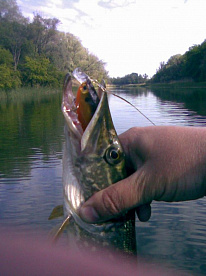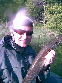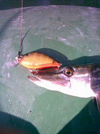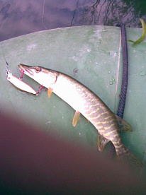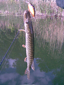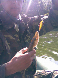 Собрались на рыбалку с братом OSVKit и с кумом.Серегой. На место приехали в 3.30 еще по темному подготовились к выходу на воду, вешаю фотоапарат на шею и хочу сделать первый кадр .-великолепие утреннего Айдара., но вот облом фотоапарат даже не включается заряда 0.,очень жаль так бы представил бы отчет намного красочней и качественней. Выплываем начинаем облавливать перспективные места ,и вот минут через 15 у меня ударчик инебольшое сопративление ,и небольшая щучка в лодке ,после фотосессии свободна. Поймана на воблер yo-zuri 44 m99.Проводка твичинг. Минут 20 затишье , потом я ловлю такую же щучку на pontom 21 krekjek,проводка твичинг,но поактивнее чем в первом случае. Потом я цепляю своего юзурика 44 м37 на ветке дерева на высоте гдето метров 5 над водой , подматываю под самую веточку рывок и мой воблерок падает на воду ,подматываю,и вот удар и довольно серьезное сопротивление, через мгновение вижу соперника , хорошая щука, немного попускаю фрикцион и дуэль началась. Победа за мной, дрожащими руками с братом минут 15 освобождали воблер из подсака. И вот мой кукан проходит испытания. Потом ловлю еще одну щучку гр. на 400 опять на понтом 21 крекджек, у брата пока 0. Потом он ловит небольшую щучку на вращающуюся блесну ,фото сессия и свободна.Потом я впоймал две щучки 800, 500гр на воблер 3d fleit желтого цвета,на равномерной проводке. брат ловит на такой же воблер еще две щучки. После я ловлю на воблер бомбер с оранживыми глазками,проводка равномер. В очках наблюдаем как щучки выходят и идут за воблерами , так одну впоимал брат. Да и я увидел как моя щучка на 800 гр. атаковала воблер. Потом затишье мы решаем немного подкрепиться.Завтракаем, имы снова на воде . Погода сразу меняется то небольшой дождик то ветер. После 11.00 у меня 0 ,а брат ловит еще одну щучку и у него три схода. Итог у меня 7 щук 3 отпущено,у брата 4 щуки впоймано 2 отпущено и 4 сорвались. Рыбалкой очень давольны. Кум ловил на попловок 5 плотвиц,1 красноперка.1 ласкирь.Фотографии сделаны на телефон, да юзурику моему щука краску подпортила здорово