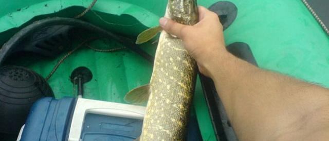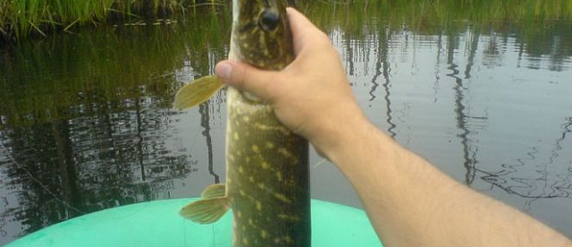 .  Погода, к моему удивлению, улучшилась и я опять поплыл, удачи прошлой субботы давали надежду на успешную рыбалку, но как-то не заладилось. 3 часа отмахал своей палкой впустую (сорвалось пару окуней,  но не за ними я пришёл). Потом я понял надо остановиться и подумать - перевести дыхание. Посидел подумал, представил поклевку как она будет, кинул впритирку к камышу и есть удар, ну наконец подумал я. И щука сразу показала свой размер сделав свечку, да бабушку поймать не удалось но и эта килограммовая щука дала бой и массу удовольствия. Вытащив щуку и посадив на кукан на душе конечно отлегло. Задача минимум выполнена.