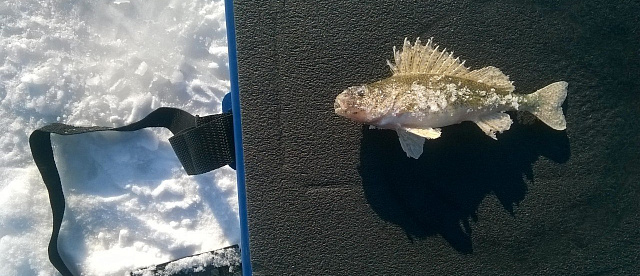 На Луганское море на пол-часика заскочил. Резкая, наглая поклевка на желейного мотыля - ерш! Хотелось бы на донец. Там рыбы больше и она больше))) Но пока думаю лед там тонкий.