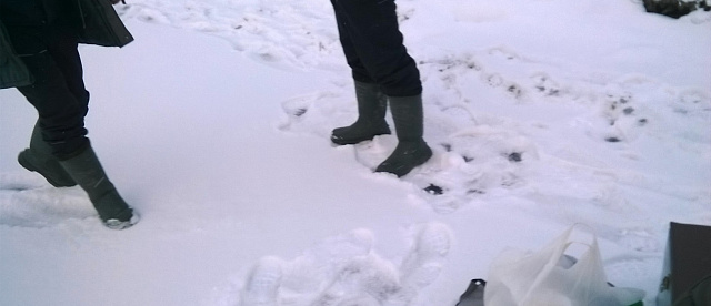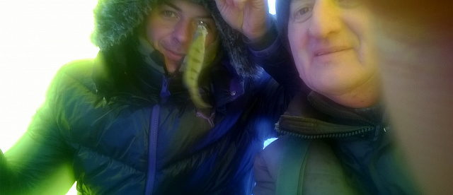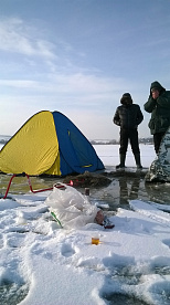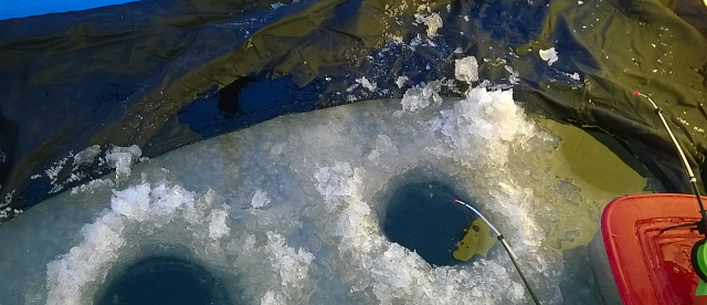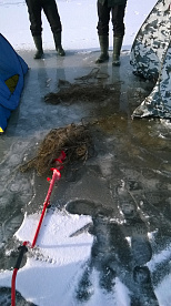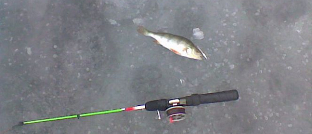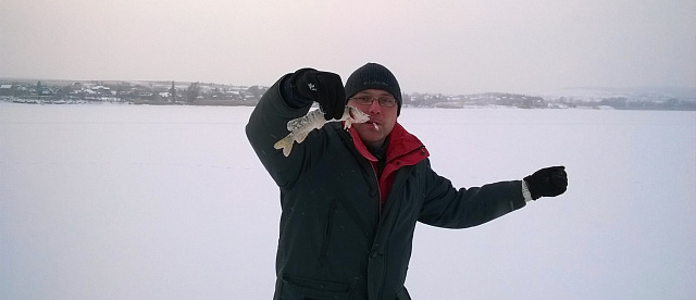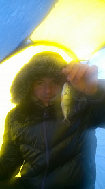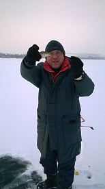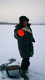 Мороз стоял -20, Лед не толстый максимум около семи см. Поскрипывал у берега. Я поймал три окушка. Одного на отвесную блесенку и двоих на мотыля. Олег поймал окушка и щучку. Балансиром зацепил сеть. Метров 10. Вытянули, была дохлая рыба и две плотвички плюс рак. Белый ловил окушков и Андрей штук пять окушков.